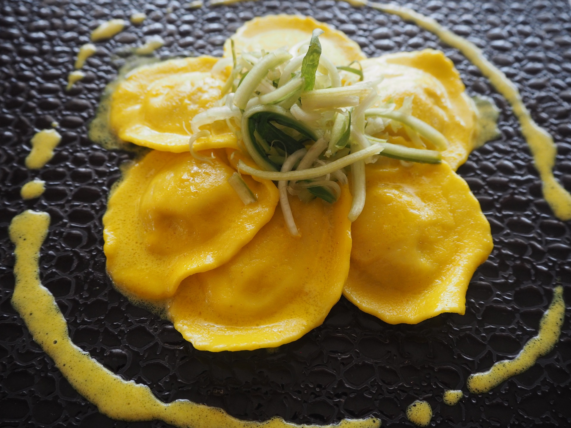 Ravioli alla borragine, burro di malga alle erbe e scaglie di Bitto